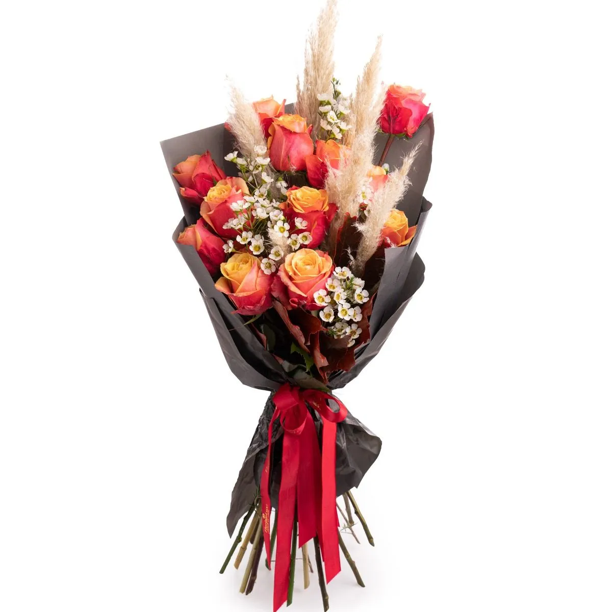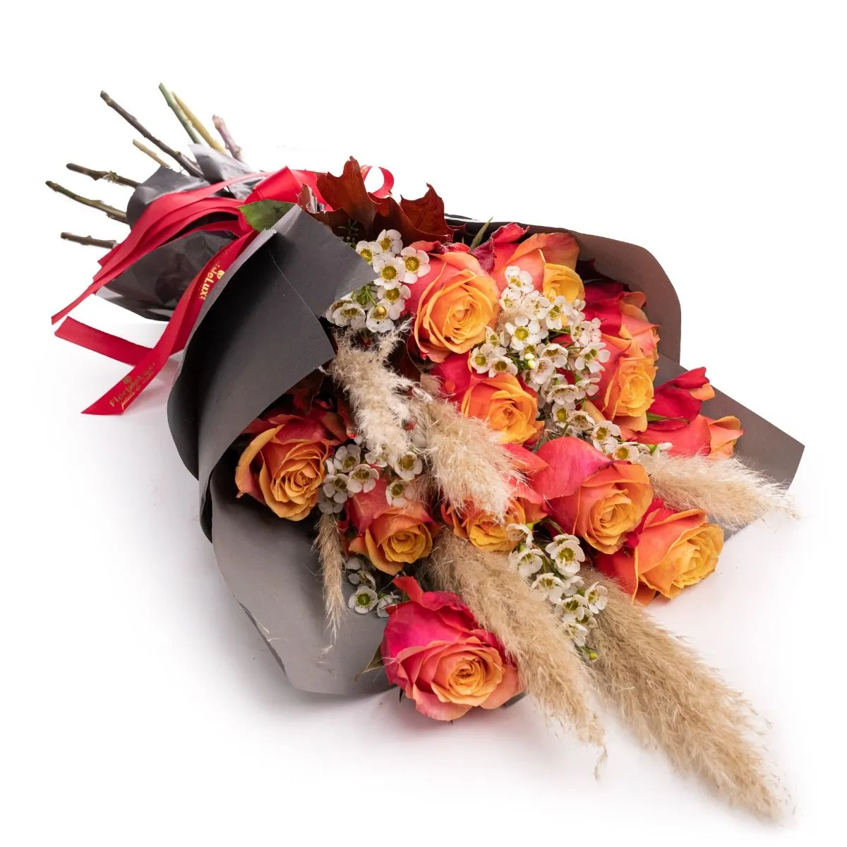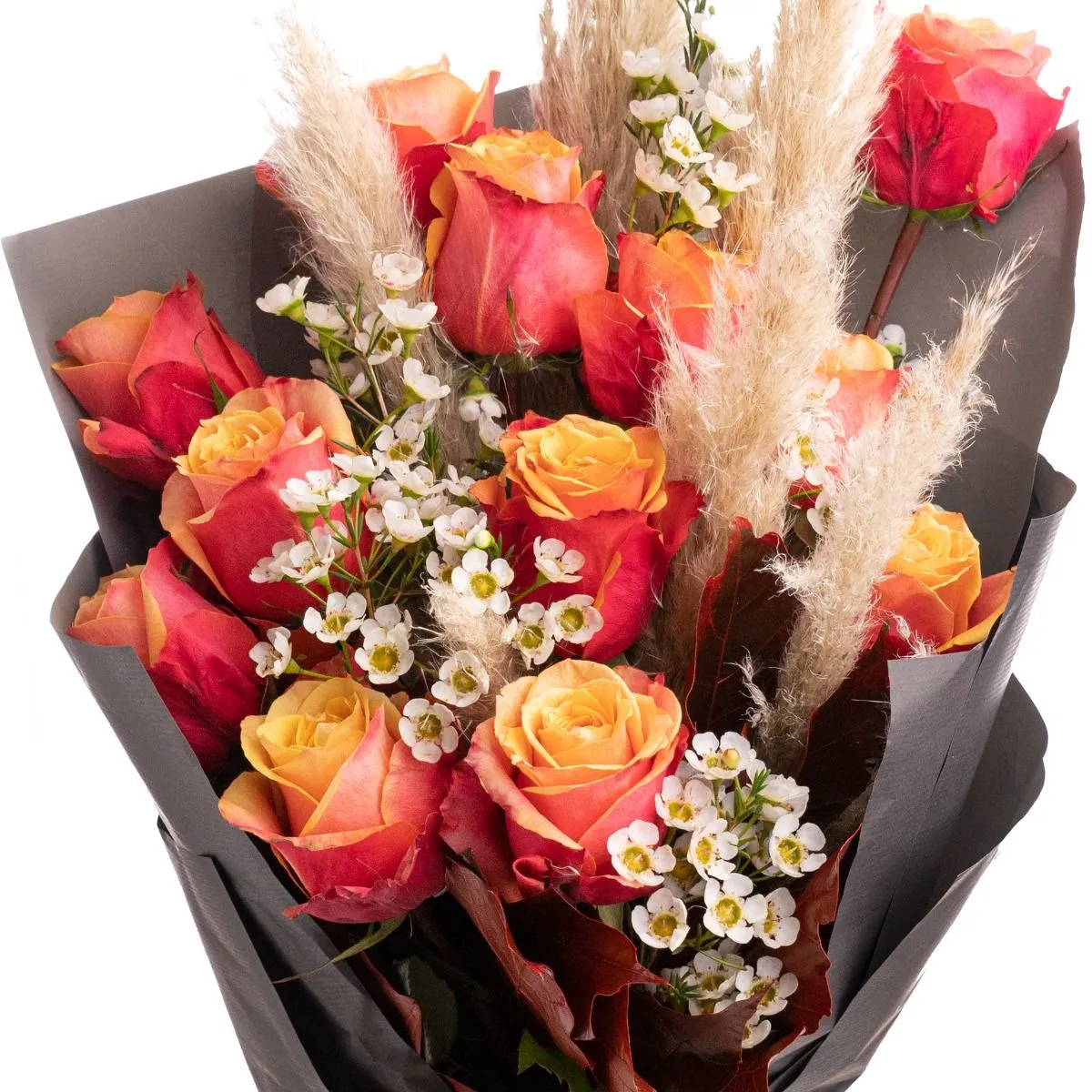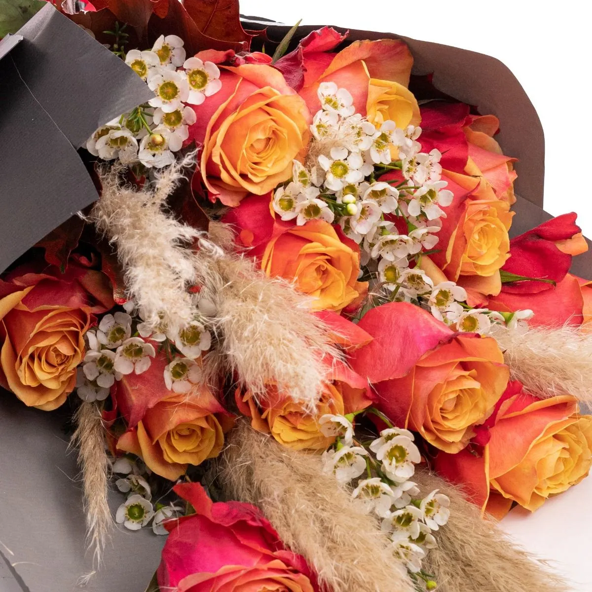 Buchet Autumn trandafiri portocalii - Un buchet deosebit in nuantele toamnei ce va impresiona pe oricine! Am combinat trandafirii portocalii, ce semnifica admiratia profunda si pasiunea, cu delicatele flori de Chamelaucium, aerul de toamna fiind amplificat de Cortaderia si frunzele ruginii.
