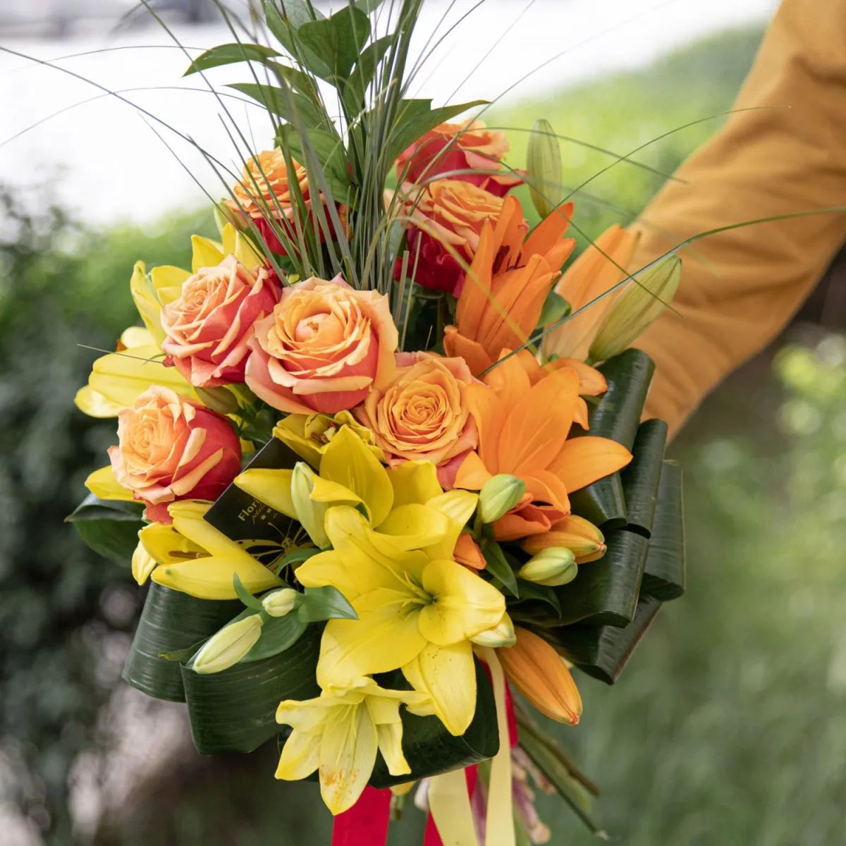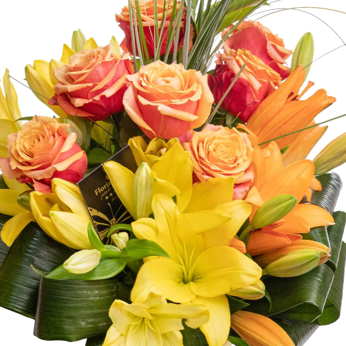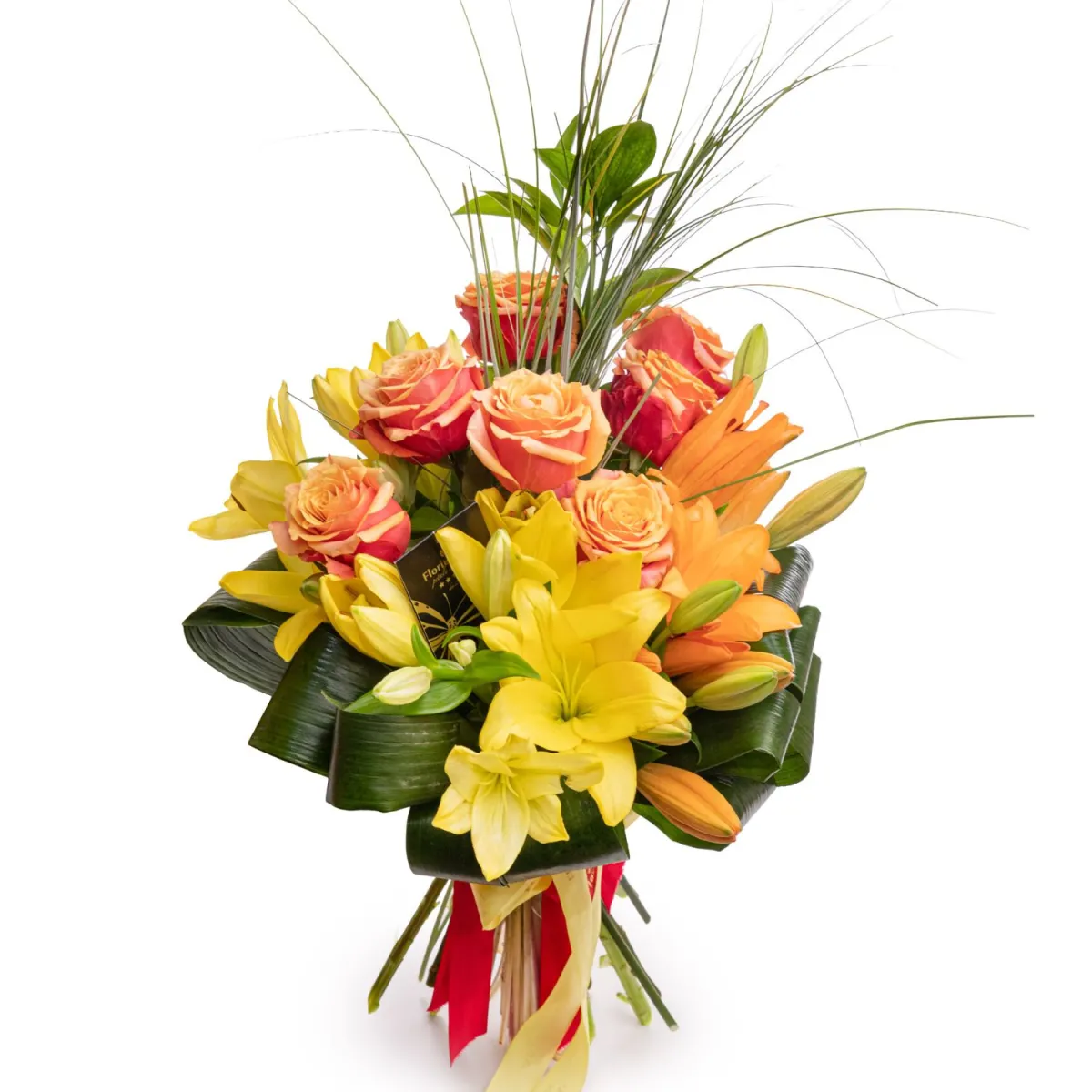 Buchetul de flori este o combinatie uimitoare de crini portocalii si galbeni, totul accentuat de trandafirii portocalii eleganti. Acesta este un cadou rafinat, perfect pentru a sarbatori o ocazie speciala sau pentru a transmite un mesaj plin de bucurie cuiva drag.