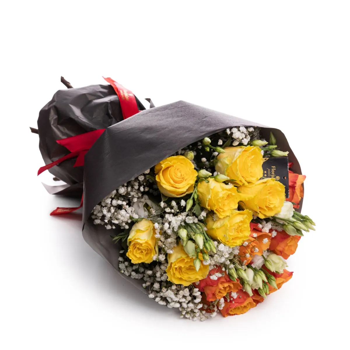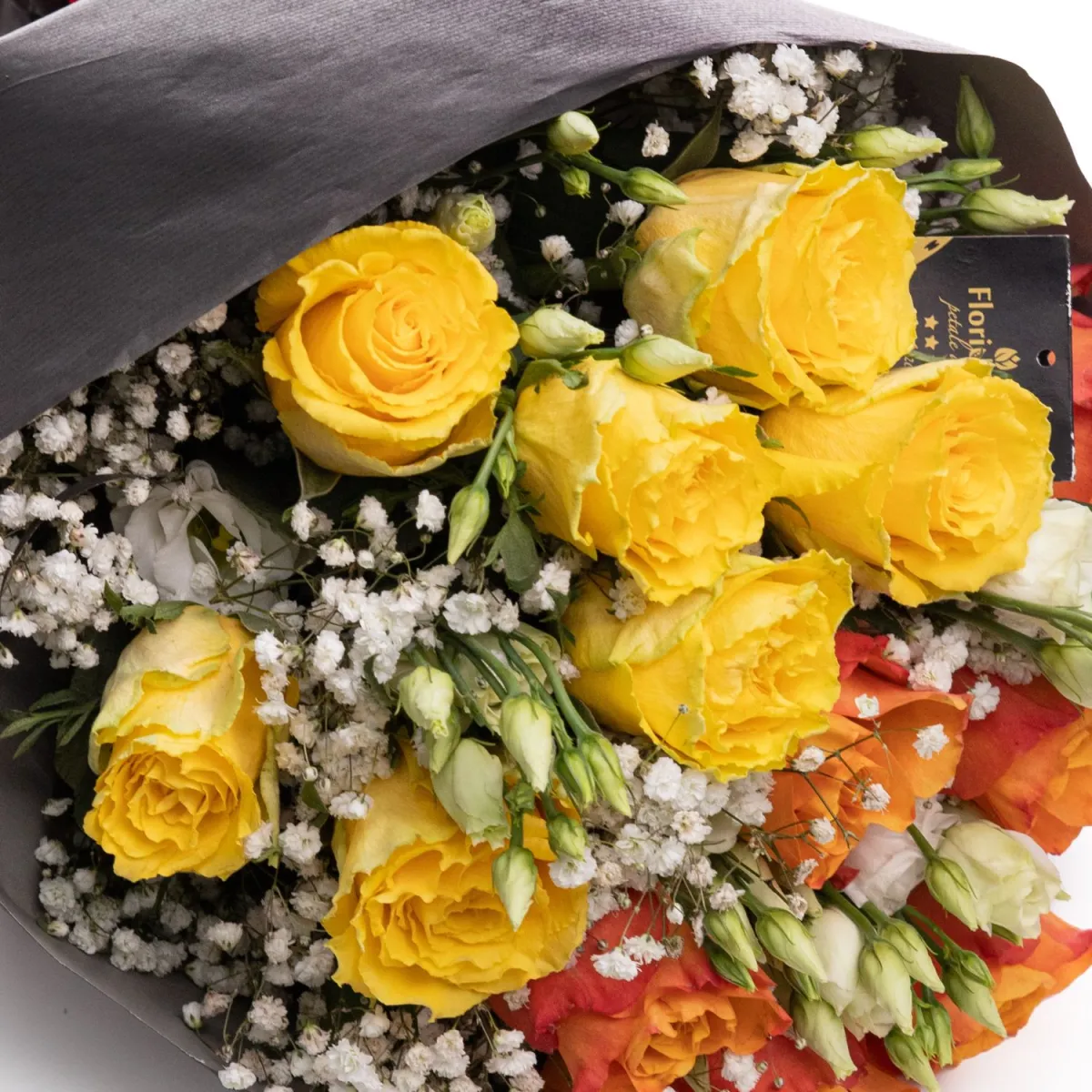 Buchet jucaus din trandafiri galbeni si portocalii, pentru un cadou plin de culoare, veselie si incantare vizuala, sufleteasca! Buchetul este creat de catre maestrii nostri floristi, cu atentie, migala si profesionalism, din trandafiri galbeni si portocalii si eustoma.