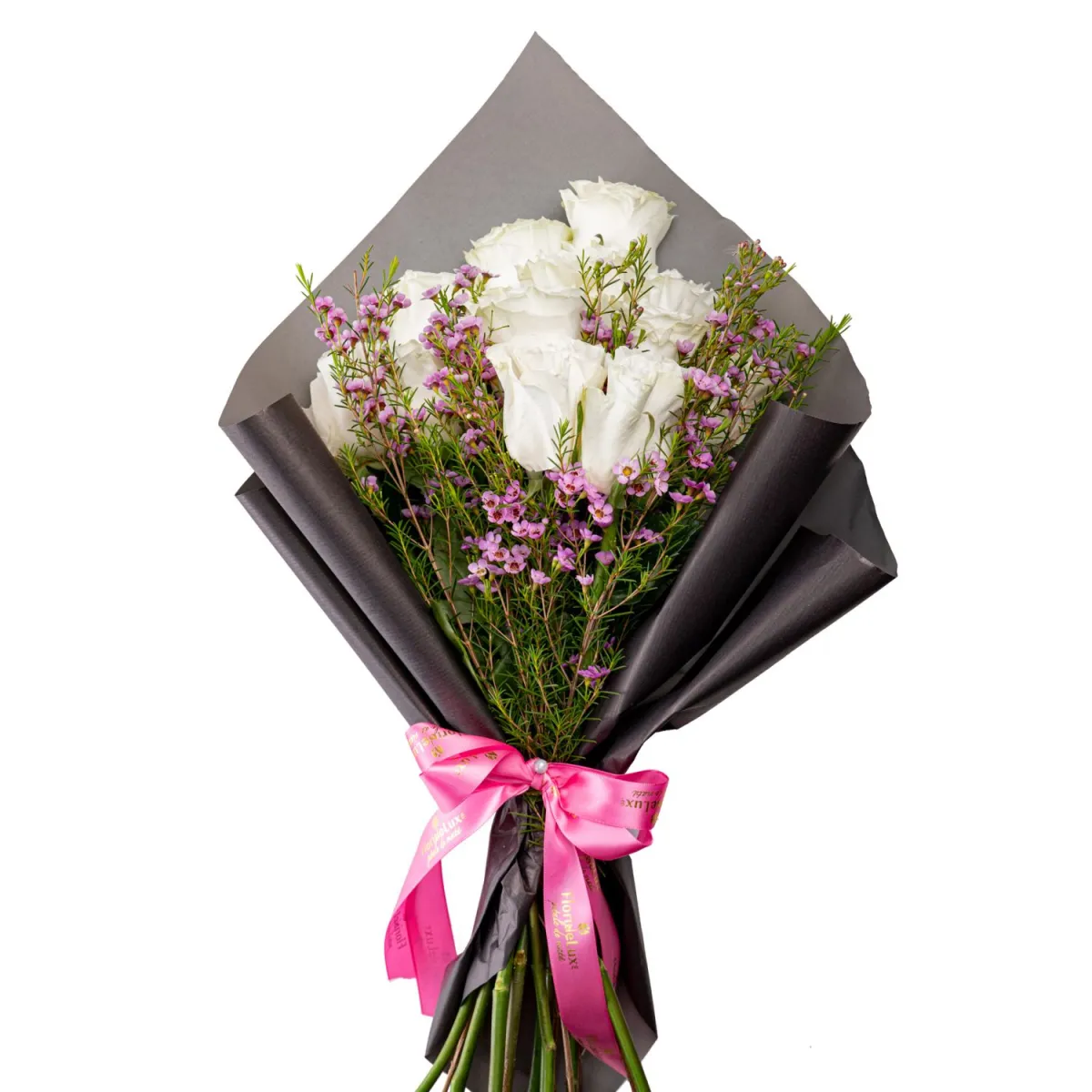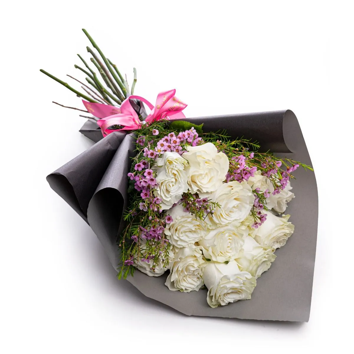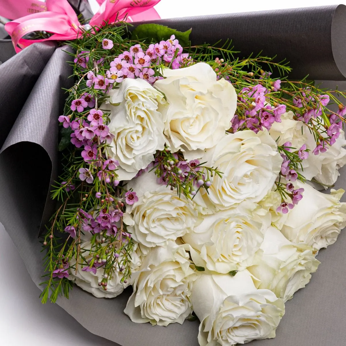Buchet trandafiri albi si chamelaucium roz - Un buchet compus din cele mai elegante flori, trandafirii albi, care transmit mesaje de iubirea sincera si loialitate, alaturi de chamelauciumul roz ce adauga delicatete. Declara-ti dragostea si spune-i cat de importanta este pentru tine cu ajutorul acestui buchet luminos, invelit intr-un ambalaj fin, negru. Plaseaza o comanda online si FlorideLux asigura transportul la domiciliu in doar 2-4 ore, oriunde in tara.