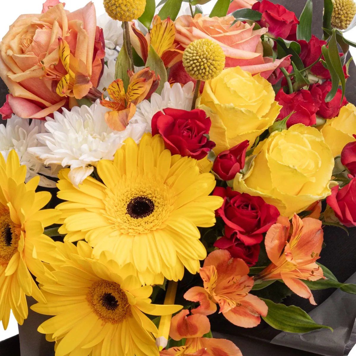 In acest buchet de flori fermecator se imbina armonios culorile si semnificatiile, creand o combinatie vibranta si plina de semnificatie. In centrul atentiei se afla stralucitoarele gerbera, care aduc cu sine bucurie, prietenie si vitalitate.
