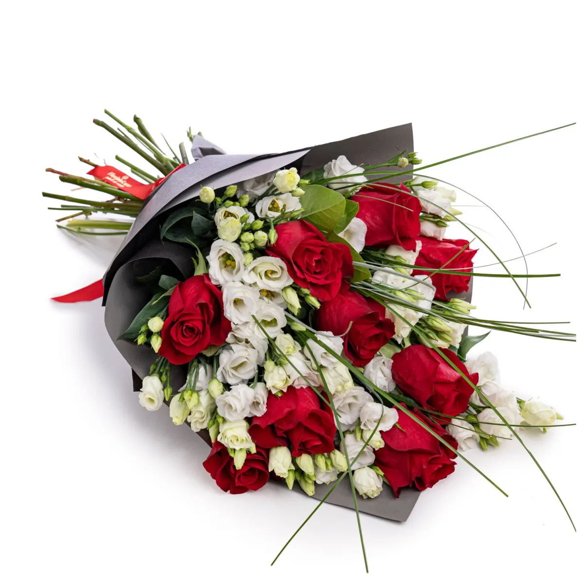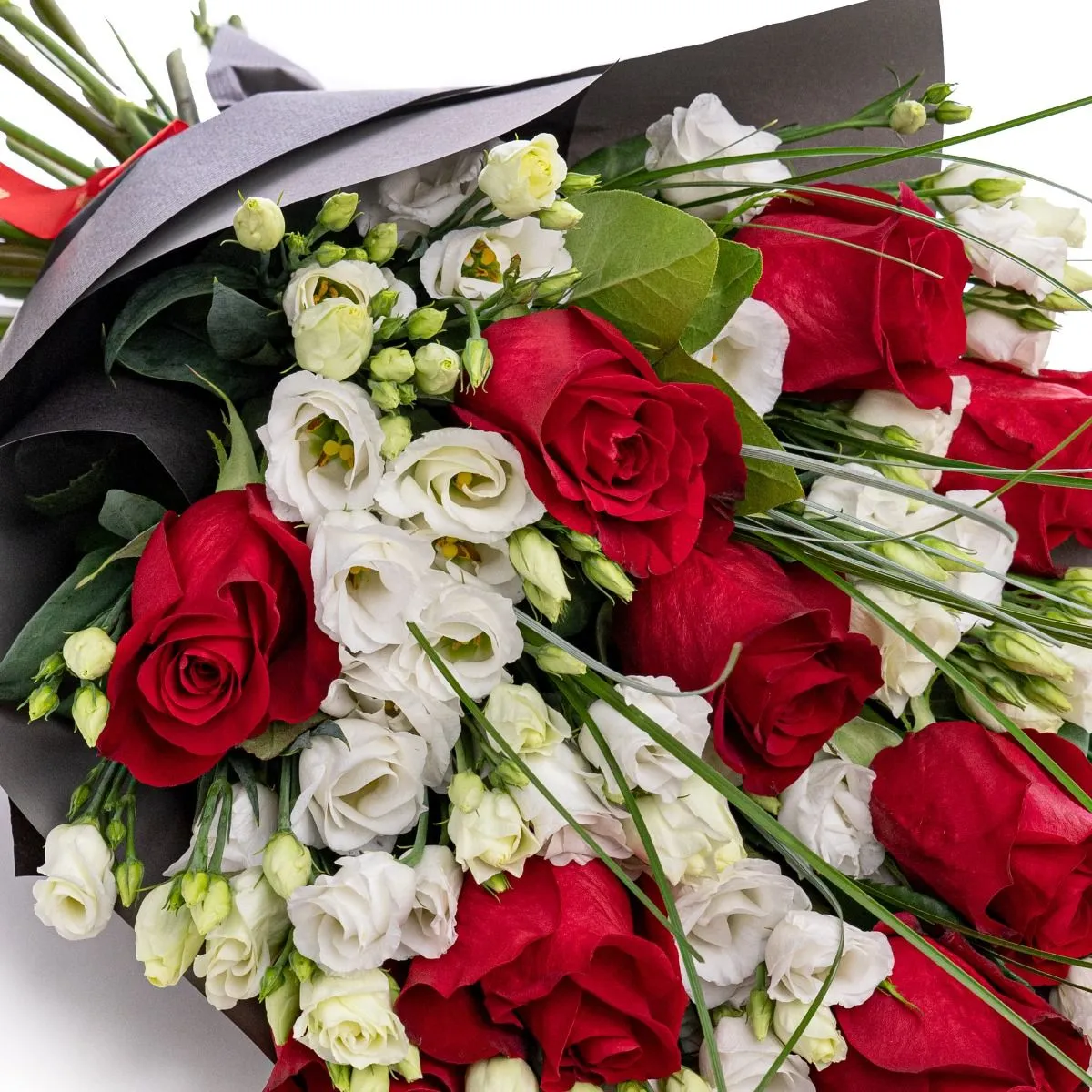Buchet trandafiri rosii si lisianthus alb - Un buchet cu adevarat special ce o va seduce pe iubita ta din prima secunda! Trandafirii rosii transmit pasiunea si iubire adevarata, iar lisianthusul alb adauga eleganta si rafinament, totul fiind invelit de cel mai fin ambalaj, de culoare neagra. Surprinde acum persoana iubita cu FlorideLux si livram in 2-4 ore, oriunde in Romania.